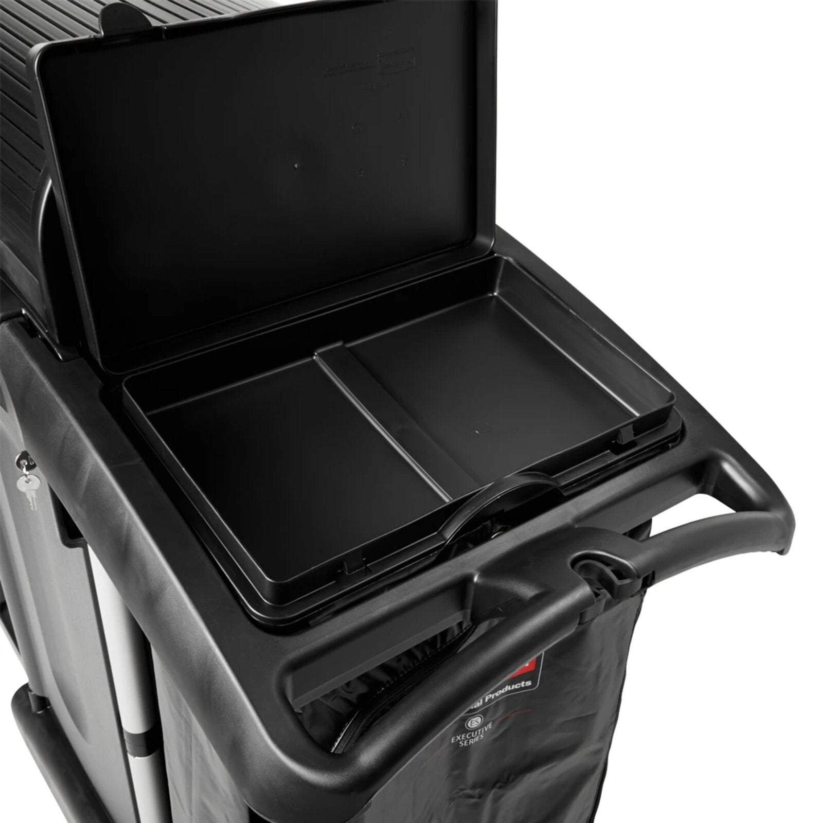 - Las puertas seguras de los gabinetes mantienen los artículos de limpieza ocultos a la vista y bajo llave cuando los carros están desatendidos.