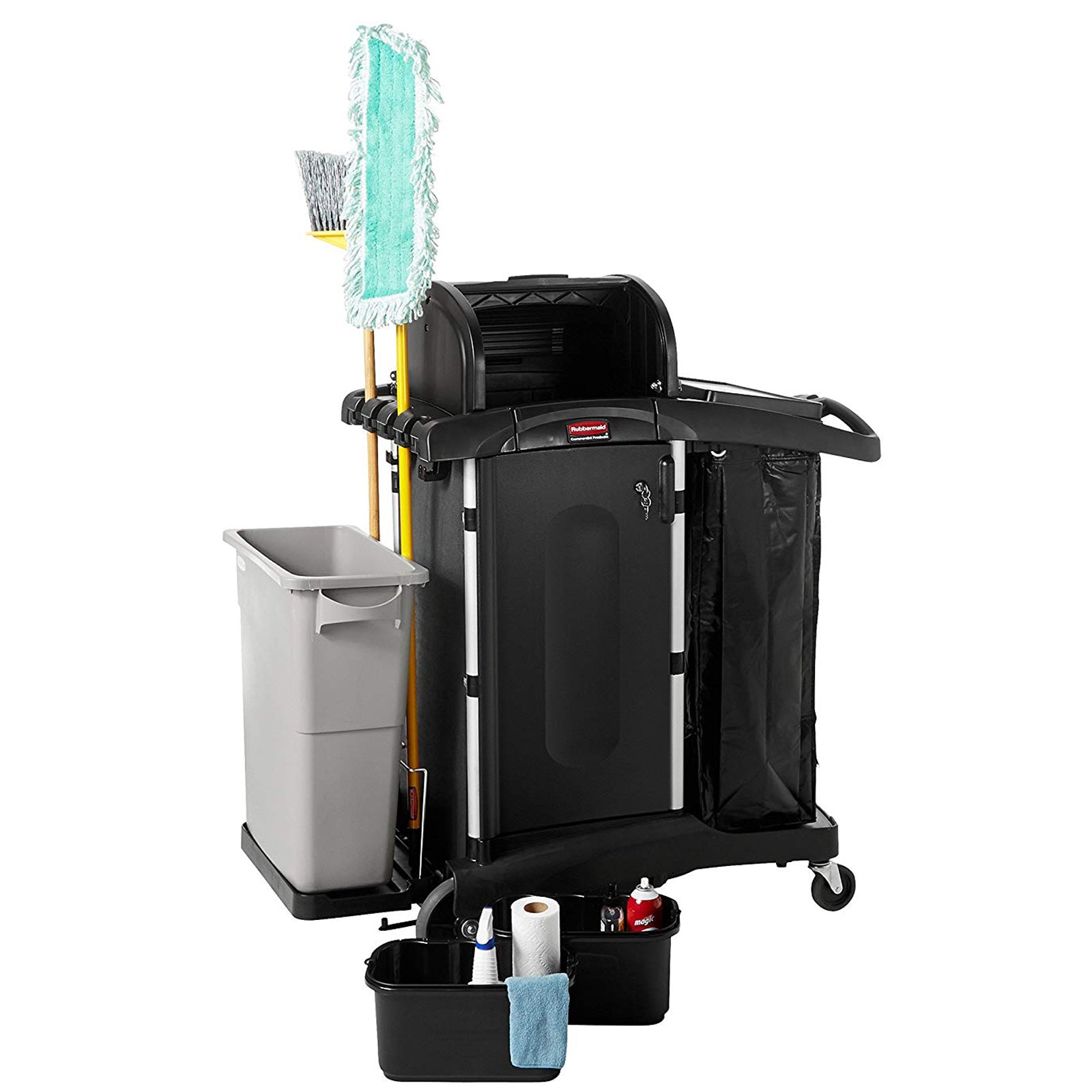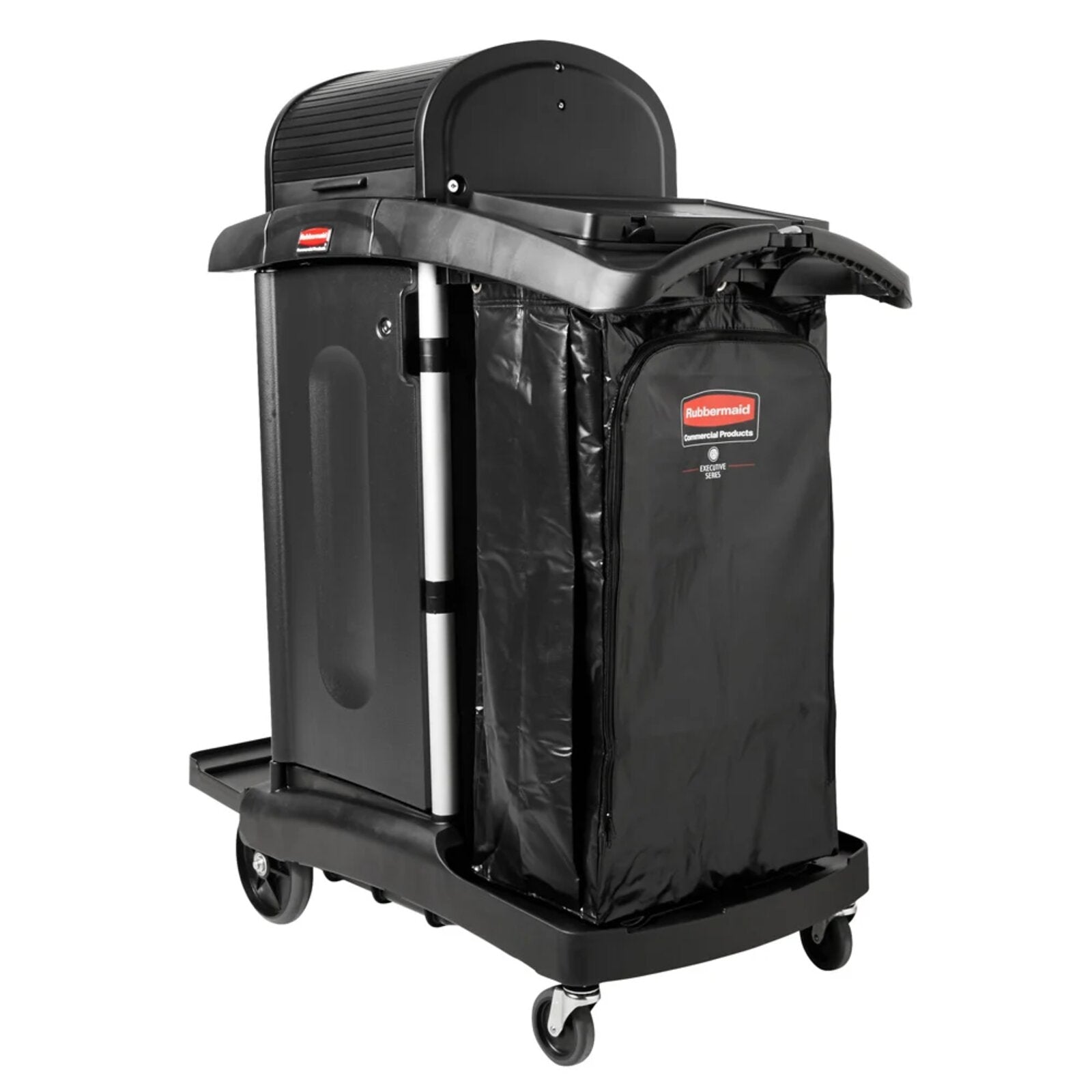 El carro de limpieza de limpieza de alta seguridad ejecutivo de Rubbermaid Commercial Products es un carro seguro que cuenta con ruedas silenciosas y con cojinetes de bolas junto con puertas y capó con cerradura preensamblados. Solución de sistema completa para la limpieza de sus instalaciones y el transporte de equipos de limpieza. Personaliza y abastece el carro de limpieza de la forma que mejor se adapte a tus necesidades.