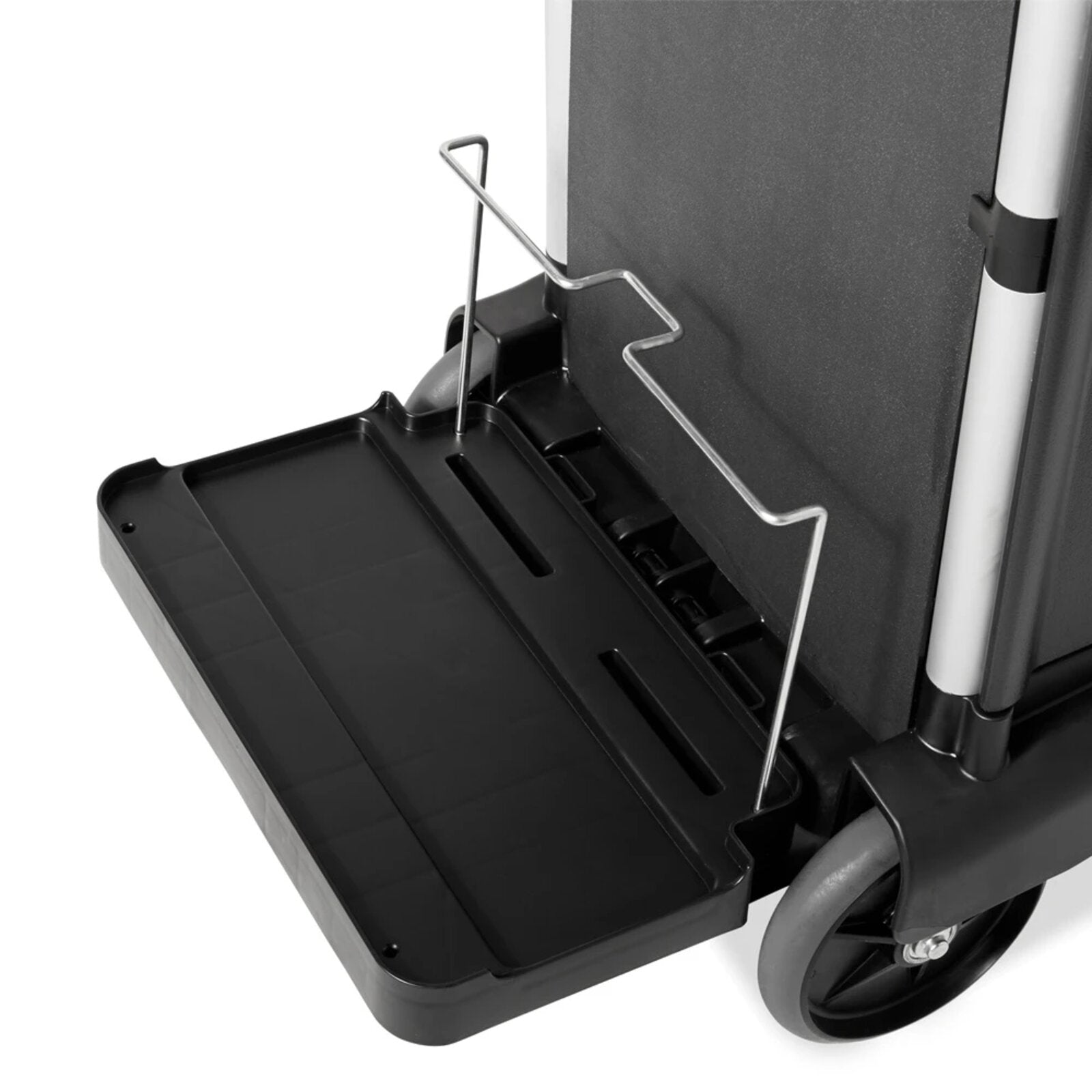 - La plataforma del cubo para trapeador con ranuras de seguridad mantiene los cubos de carga WaveBrake® o de microfibra sujetos de forma segura al carrito.